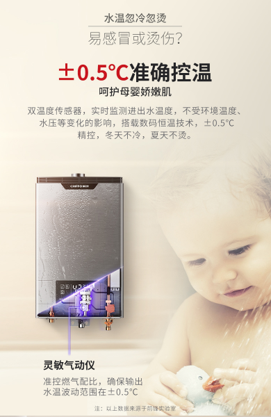 針對洗浴出水忽冷忽熱的痛點(diǎn),前鋒F703熱水器獨(dú)具匠心的雙溫傳感器,實(shí)時(shí)監(jiān)測進(jìn)出水溫度,搭載數(shù)碼恒溫技術(shù),冬夏自動(dòng)適溫,真正實(shí)現(xiàn)“冬天不冷、夏天不燙”的現(xiàn)代沐浴新要求。同時(shí)依據(jù)設(shè)定溫度,出水溫差控制在±0.5℃范圍內(nèi),讓用戶徹底告別忽冷忽熱,真正享受到嬰兒般的恒溫舒適沐浴體驗(yàn)。